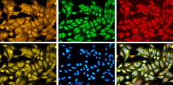 Credit : Broad Institute of MIT and Harvard. Human cells imaged using Cell Painting are treated with fluorescent dyes that mark different cellular components, including the nucleus, nucleoli, cytoplasmic RNA, Golgi, endoplasmic reticulum, mitochondria, actin cytoskeleton, and plasma membrane.