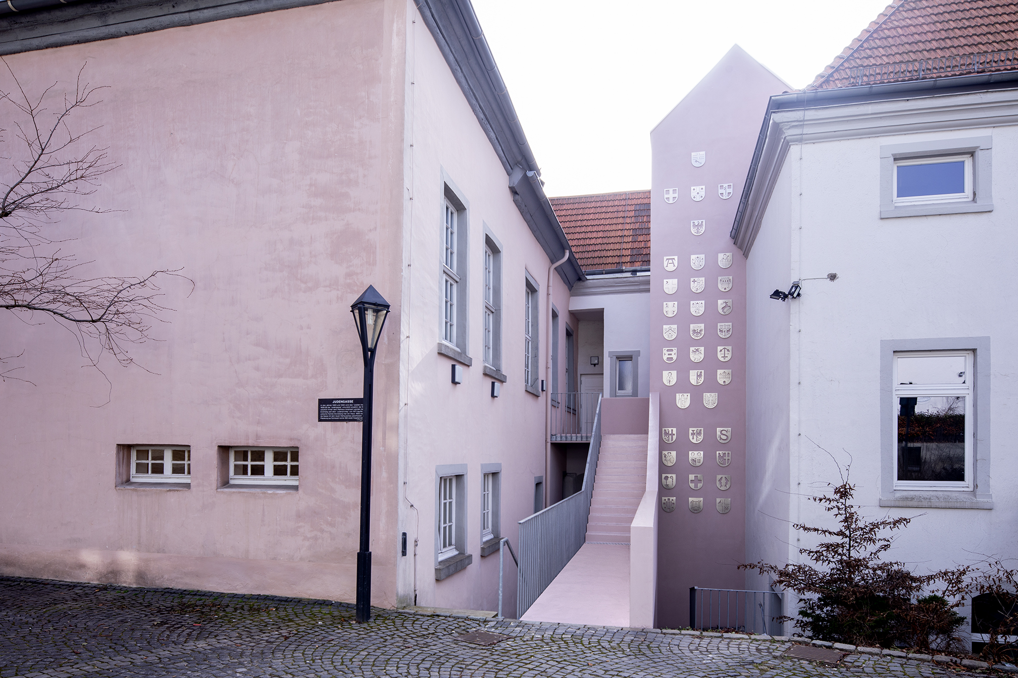 Entscheidend für das harmonische Gesamtbild von Bestand und Neubauten war vor allem die Farbangleichung. Der Original-Farbton des Alten Rathauses wurde durchgängig auf Turm und Treppe übertragen, wodurch trotz unterschiedlicher Caparol-Produkte der Eindruck eines Ensembles aus einem Guss entsteht (Foto: Caparol Farben Lacke Bautenschutz/DISBON/Andreas Wiese)