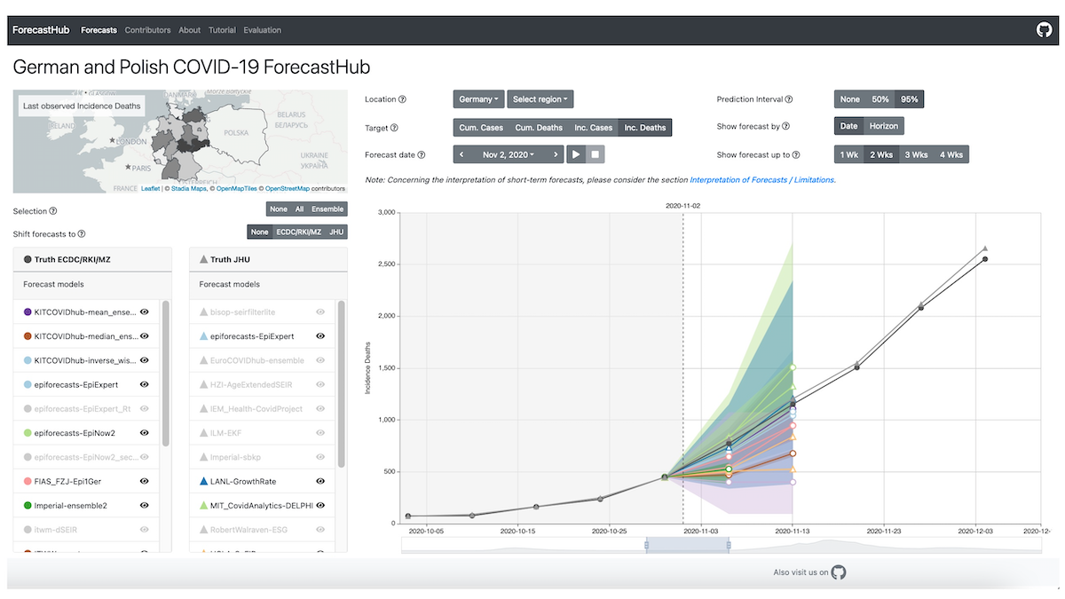 Screenshot der Plattform, mit den verschiedenen Vorhersagemodellen auf der linken Seite (Quelle: German-Polish COVID-19 Forecast Hub)