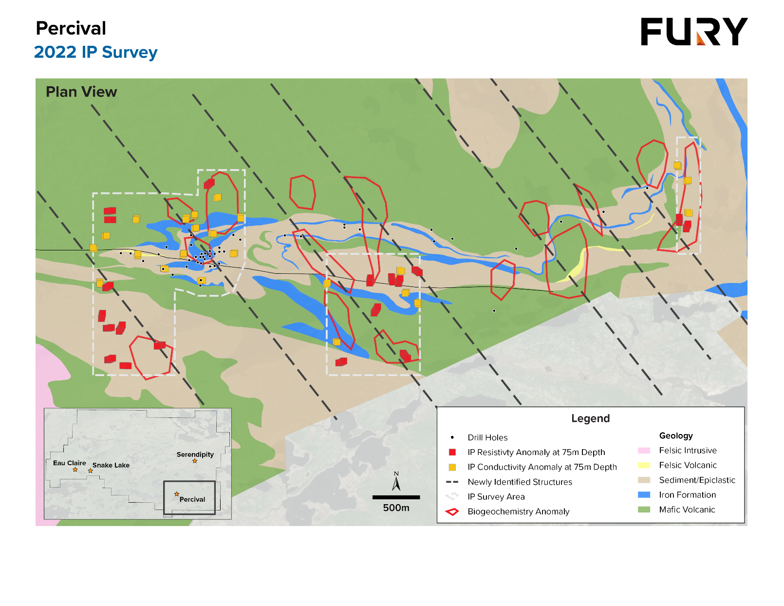 Abbildung 1: Draufsicht auf den Percival-Trend, die die IP-Untersuchungslinien mit den Widerstands- und Leitfähigkeitsanomalien im Verhältnis zu den 15 biogeochemischen Goldanomalien auf der regionalen ersten vertikalen abgeleiteten Magnetik zeigt