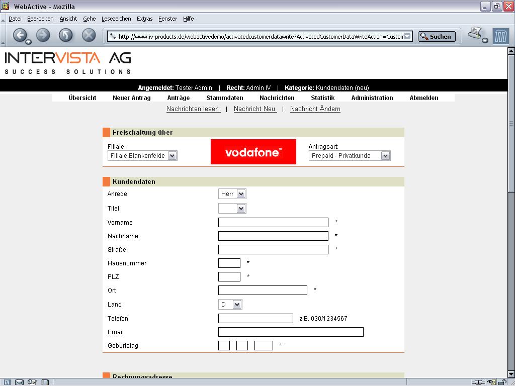 Vertragsaktivierungsmaske von IV::WEBACTIVE