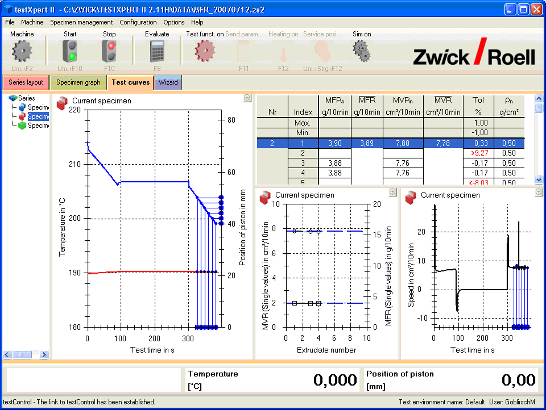Die Prüfsoftware testXpert II erlaubt die Berechnung der MFR und MVR Werte und liefert ergänzende Daten zur Überwachung des kompletten Testverfahrens