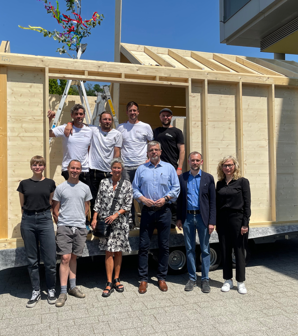 Richtfest an der HK: Ein Tiny House wird bald auf dem Campus als Experimentierfeld zur Verfügung stehen. Mit dabei waren (v.l.n.r., vordere Reihe) Leila Baron (Masterstudentin Innenarchitektur), David Oehme (Masterstudent Architektur), Beate Kimmel (designierte OB von Kaiserslautern), Prof. Dr.-Ing. Hans-Joachim Schmidt (Präsident der Hochschule), Prof. Dr.-Ing. Karsten Glöser, Prof. Dipl.-Ing. Brigitte Al Bosta; dahinter die Mannschaft des Lieferanten und Partners Tiny House Bausätze