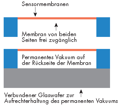 Abbildung 6: Oben ein differenzieller Sensorchip, der mittels aufgebondetem Glaswafer zu einem Absolutdrucksensor (unten) wurde