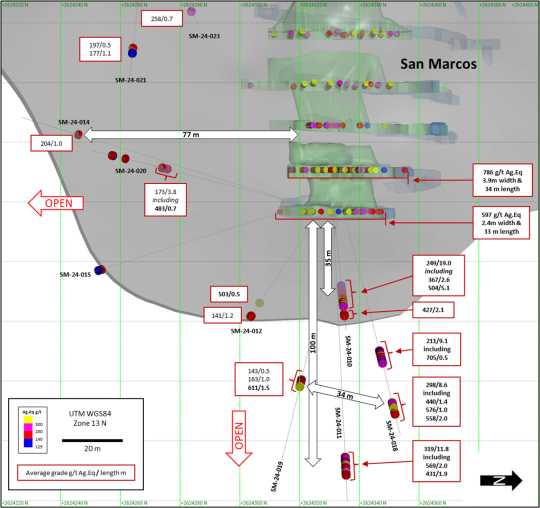 Abbildung 2: Zone San Marcos - Schrägansicht Blickrichtung Westen mit wichtigen Ergebnissen der Bohrungen SM-24-018 bis 023