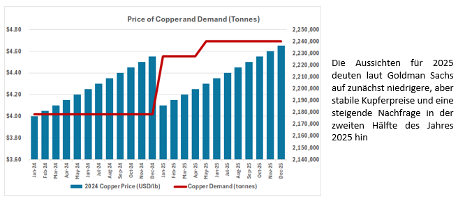 Grafik 1: Preis und Nachfrage von Kupfer 2024 / 2025 Schätzung / Quelle: Mining Gm