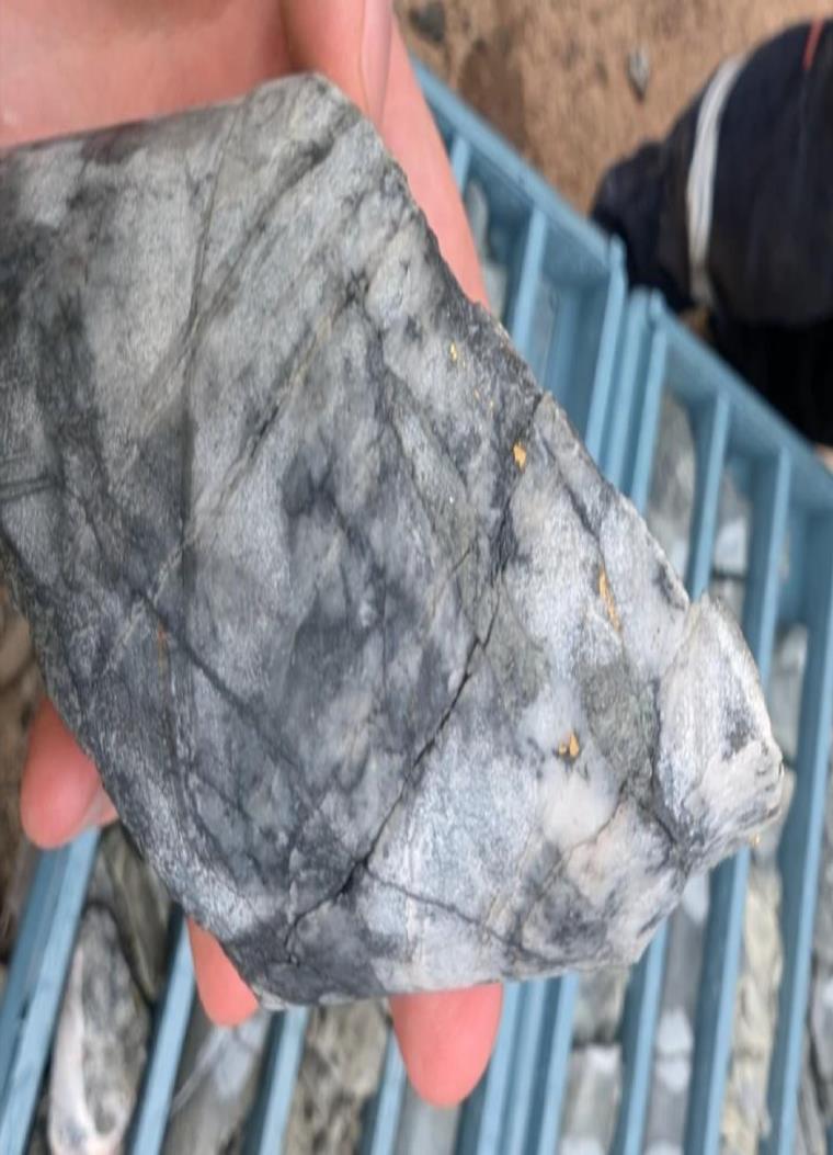 Abbildung 2: Quarz-Stibnit-Ader mit grobem sichtbarem Gold auf 776,6 m. Der Abschnitt ergab 0,16 m mit 3.330 g/t Au und 11,7 % Sb auf 776,6 m. Der Maßstab des Bildes beträgt etwa 16 cm