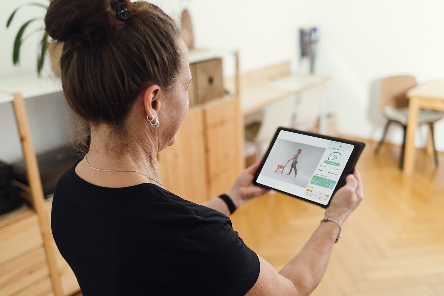 Eine Frau beim Training mit eCovery auf ihrem Tablet: Die App für iOS und Android ist sowohl für Tablets als auch für Smartphones konzipiert und kann bei Bedarf auch mit dem heimischen TV-Screen gekoppelt werden.