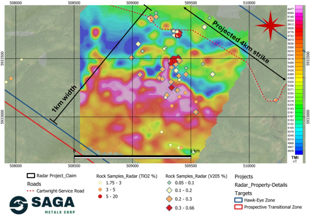 Abbildung 4: Geophysikalische Daten über einem Zielgebiet innerhalb der Zone Hawkeye mit einer zunehmenden Mächtigkeit von 1 km und einem prognostizierten Streichen von 4 km