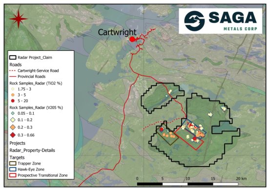 Abbildung 1: Regionale Karte des Ti-V-Projekts mit Darstellung von Hawkeye, Trapper und der dritten Übergangszone und der Nähe des Projekts zur Stadt Cartwright, Labrador