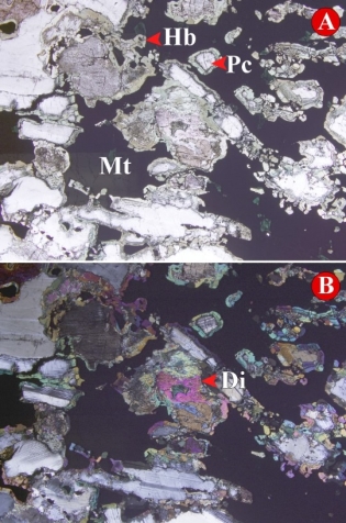 Abbildung 4: Die Petrografie der Zone Hawkeye zeigt bedeutende Magnetitmineralisierung (Mt) mit Grundmasse aus Hornblende (Hb), Diopsid/ Orthopyroxen (Di) und Plagioklas.