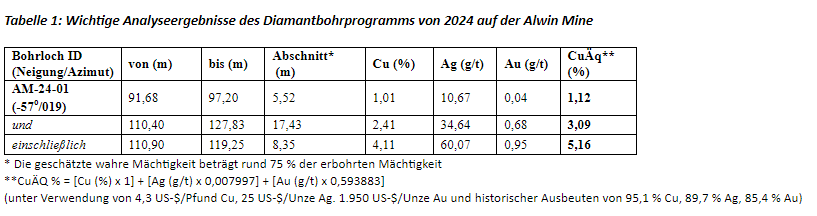 Tabelle 1: Wichtige Analyseergebnisse des Diamantbohrprogramms von 2024 auf der Alwin Mine