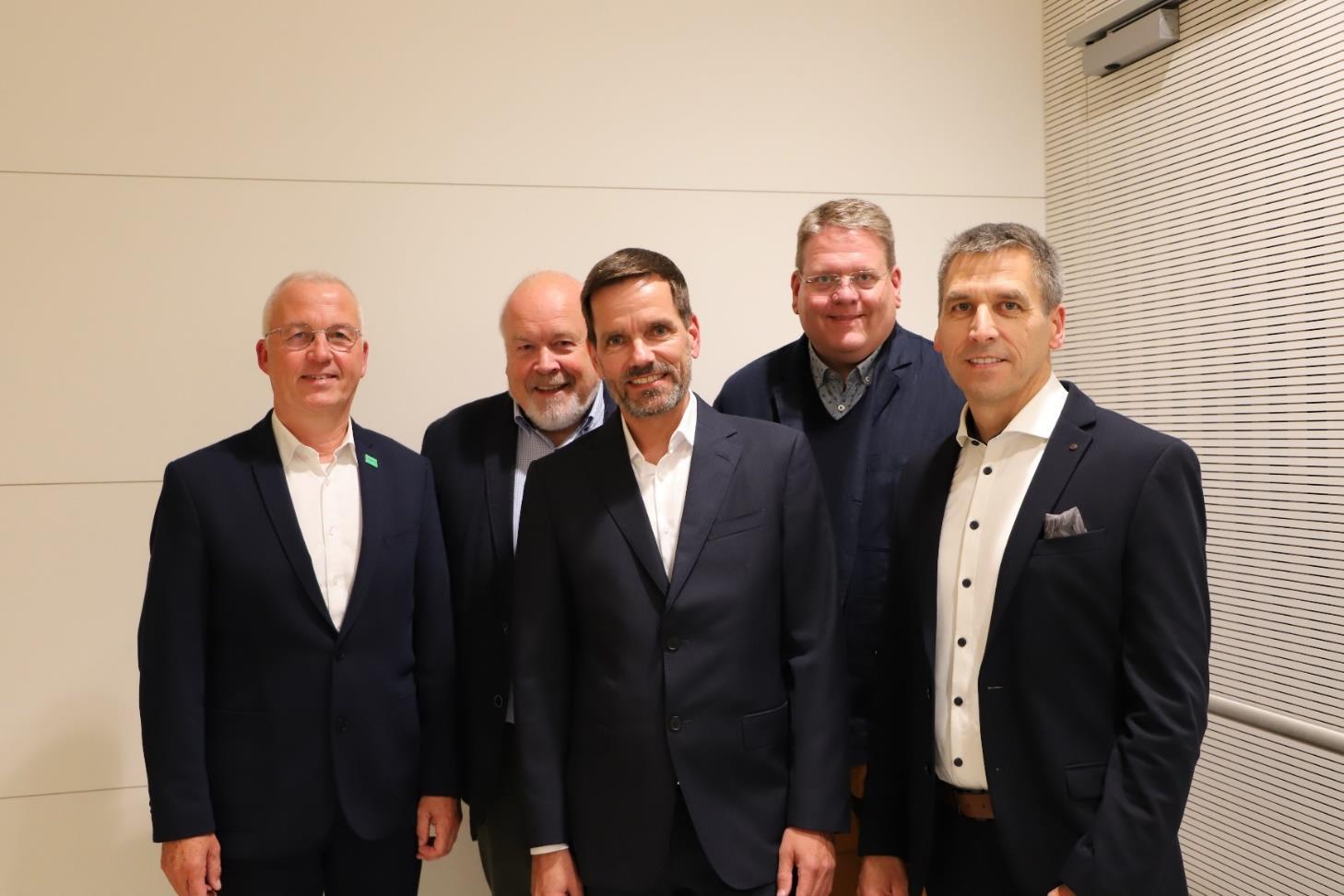 Verbandsspitze und Geschäftsleitung freuen sich auf eine konstruktive Zusammenarbeit für die Kommunen der Region: (v.l.n.r.): Bernd Kürpick (Geschäftsleiter OWL-IT), Rüdiger Meier (stellv. Verbandsvorsteher, Bürgermeister Gemeinde Kirchlengern), Matthias Stoller (designierter Sprecher der Geschäftsleitung OWL-IT), Kai Abruszat (Vorsitzender der Verbandsversammlung, Bürgermeister Gemeinde Stemwede) und Burkhard Schwuchow (Verbandsvorsteher, Bürgermeister Stadt Büren)