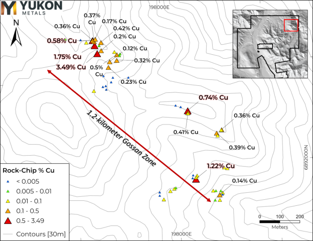 Abbildung 4 - Gesteinssplitterproben mit prozentualem Kupfergehalt bei Chair Mountain, Konzessionsgebiet AZ.