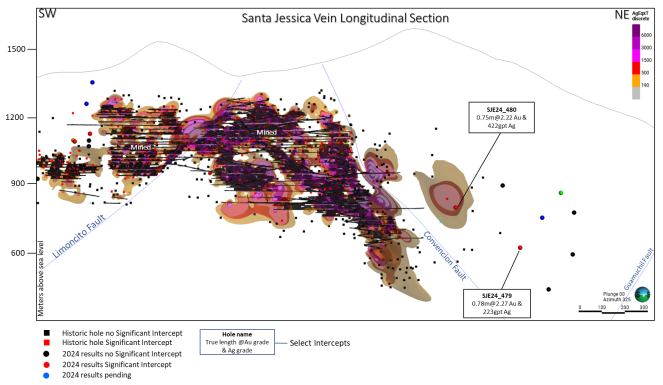 Abbildung 5: Erzgang Santa Jessica – Gehalte x Mächtigkeit, vertikaler Längsschnitt Blickrichtung Norden
