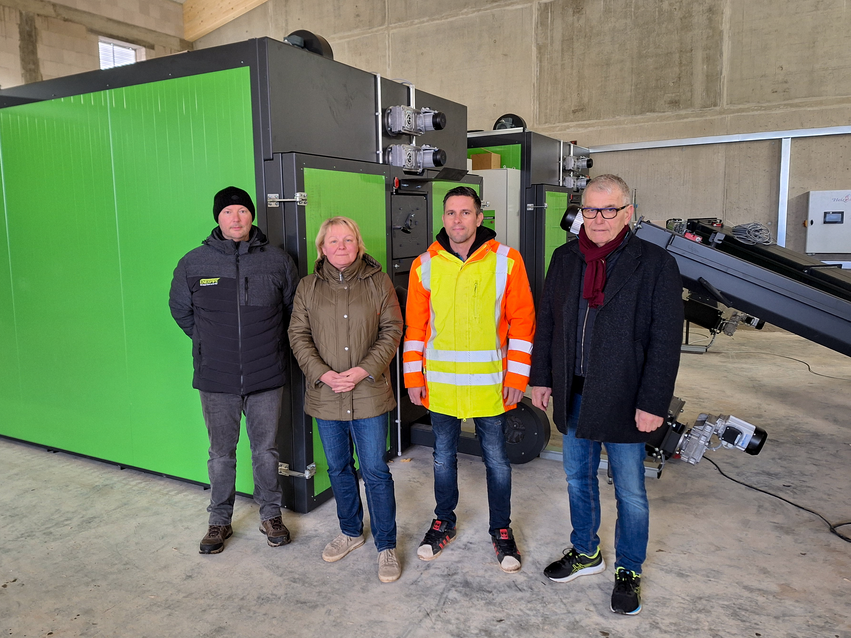 v.l.n.r.: Florian Schroll (Gebietsleiter Mitteldeutschland, ENERPIPE), Regina Bruckmann (Bürgermeisterin Lonnerstadt), Daniel Kammerer (Bauamtsmitarbeiter), Herbert Krafft (Geschäftsführer Wärmenetz Lonnerstadt UG & Co. KG) Bei der Baustellenbegehung des neuen Heizhauses.
