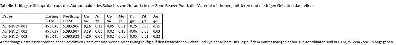 Tabelle 1. Jüngste Stichproben aus der Abraumhalde des Schachts von Noranda in der Zone Beaver Pond, die Material mit hohen, mittleren und niedrigen Gehalten darstellen.