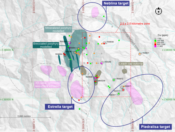 Abbildung 2: Planansicht des Porphyrsystems Mocoa mit den Analyseergebnissen von Gesteinsproben und einer 3D-Projektion auf die Oberfläche, die die mineralisierten und brekziösen Porphyre bei der porphyrischen Cu-Mo-Lagerstätte Mocoa hervorhebt
