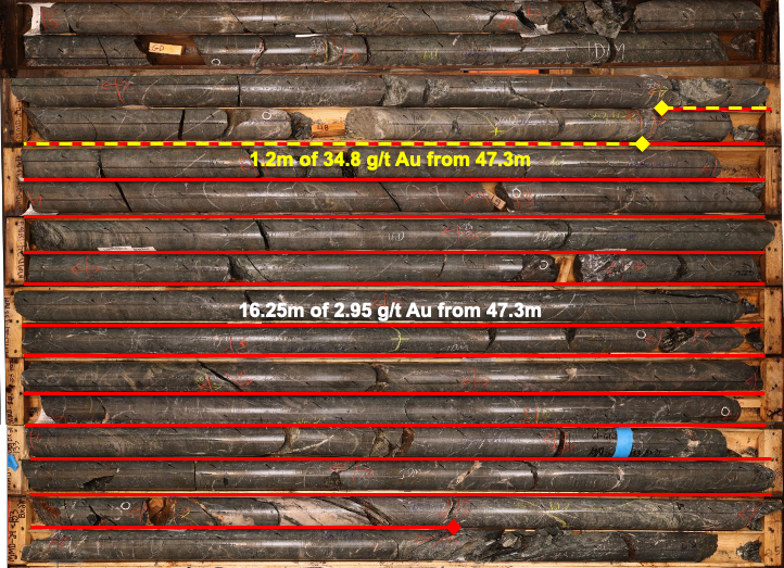 Abbildung 3: Zeigt den Bohrkern von Bohrloch MMD-24-133, der durch eine gestapelte Abfolge von hochgradigen Scherflächen innerhalb eines alterierten Granodiorits gekennzeichnet ist, der 16,25 m mit 2,95 g/t Au von 47,3 bis 66,55 m ergab.