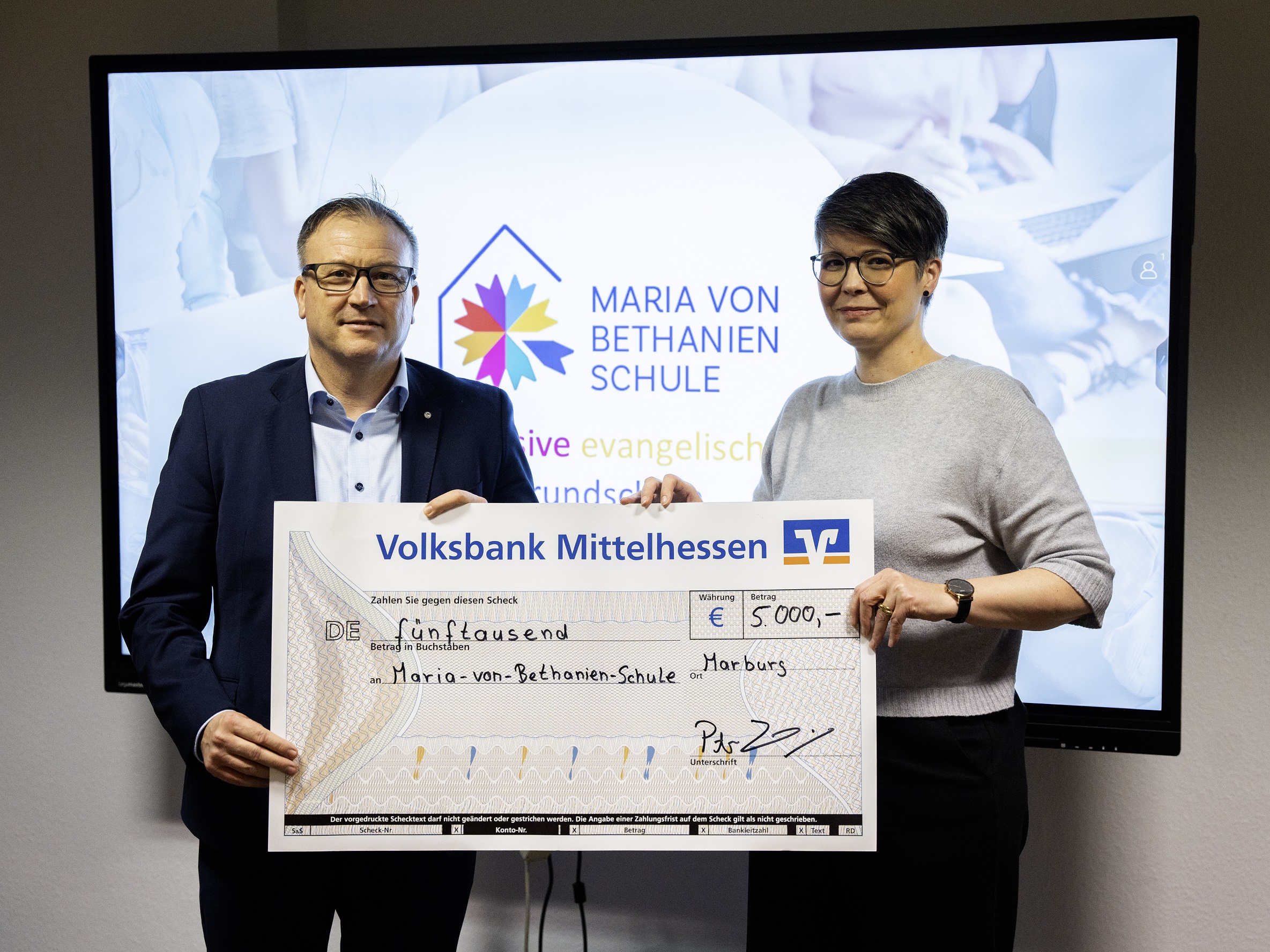 Peter Michael Weimar, Mitglied der Infrareal Geschäftsführung, bei der symbolischen Scheckübergabe an die Schulleiterin der Maria von Bethanien Schule, Isabelle Nickel