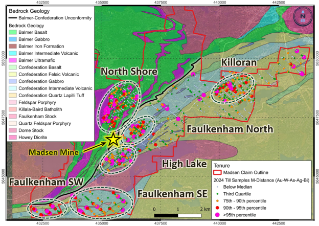Abbildung 1. Karte mit anomalen Bereichen, die durch die Oberflächenprobenahmen 2024 definiert wurden und sich durch die geochemische Signatur Au-W-As-Ag-Bi auszeichnen. Diese geochemische Struktur ist gleichbedeutend mit Madsen-artiger Goldmineralisierung und charakteristisch für Goldmineralisierung an anderen Stellen im Bezirk Red Lake.
