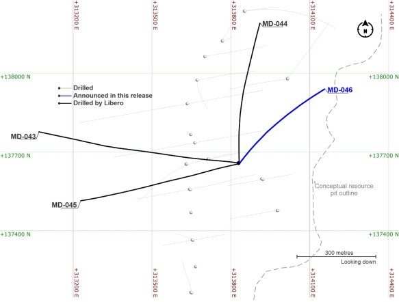 Abbildung 1. Planansicht der Bohrung MD-046 (Einfluss der Projektion 50 m). *Alle Koordinaten sind UTM-Koordinaten, Zone 18N und Ausrichtung WGS84.