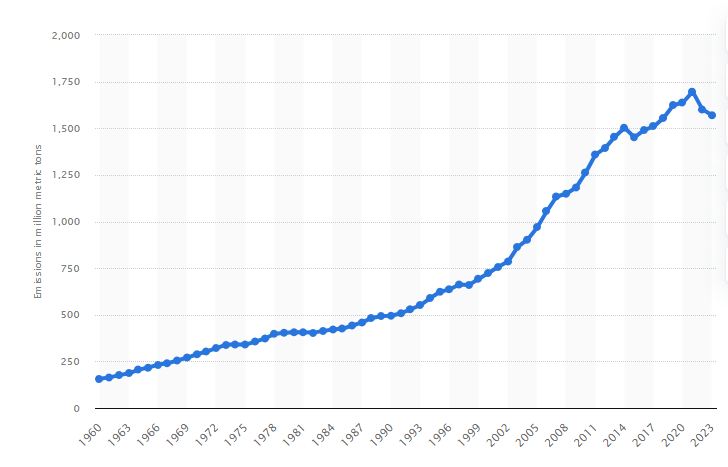 Carbon dioxide emissions from the manufacture of cement worldwide from 1960 to 2023 (in million metric tons) / https://www.statista.com/statistics/1299532/carbon-dioxide-emissions-worldwide-cement-manufacturing/