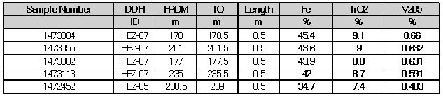 Tabelle 2: Hochgradige Proben aus HEZ-07 & HEZ-05 zeigen eine Korrelation zu höherem Titan-Magnetit-Gehalt in Proben.