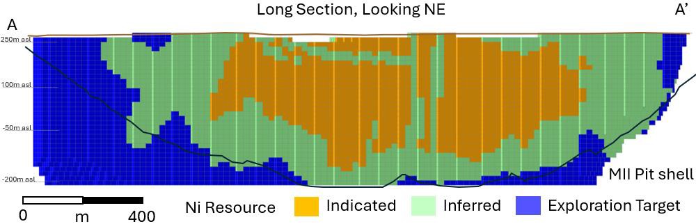 Abbildung 3. Langer Schnitt (Blick nach Norden) der Ressourcenkategorien (OBEN) und des Nickelgehalts (UNTEN) des Projekts Mann West Nickel Sulphide.