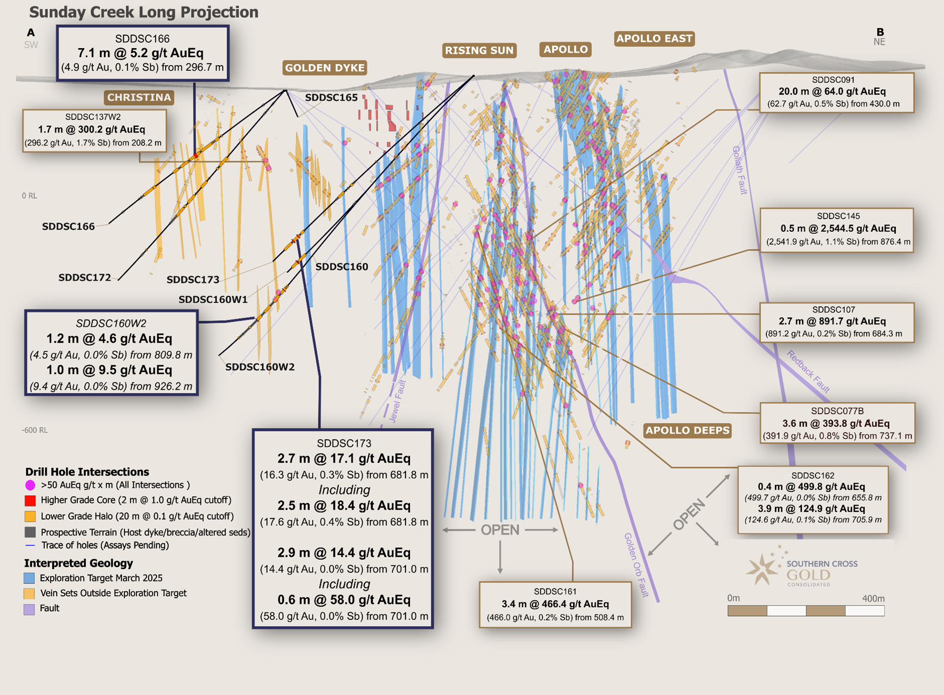 Abbildung 3: Längsschnitt Sunday Creek quer durch A-B in der Ebene des Gangbrekzien-/alterierten Sedimentwirtsgesteins in Richtung Norden (Streichung 236 Grad) mit mineralisierten Gangsätzen. Zeigt die hier gemeldeten Bohrlöcher SDDSC160, SDDSC160W1, SDDSC160W2, SDDSC165, SDDSC166, SDDSC172 und SDDSC173 (dunkelblau hervorgehobener Kasten, schwarze Linie) mit ausgewählten Abschnitten und zuvor gemeldeten Bohrlöchern. Die vertikale Ausdehnung der Adergruppen ist durch die Nähe zu den Bohrlochdurch