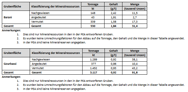 Tabelle 6. Mineralressourcen in den geplanten Gruben Barani und Gourbassi