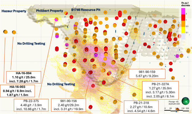 Abbildung 1: Blick nach Nordosten; Abschnitt mit einer Neigung von 45 Grad und einer Mächtigkeit von 100 Metern; derzeitige Bohrlöcher fettgedruckt, Werte zeigen Gehalte in Au g/t.