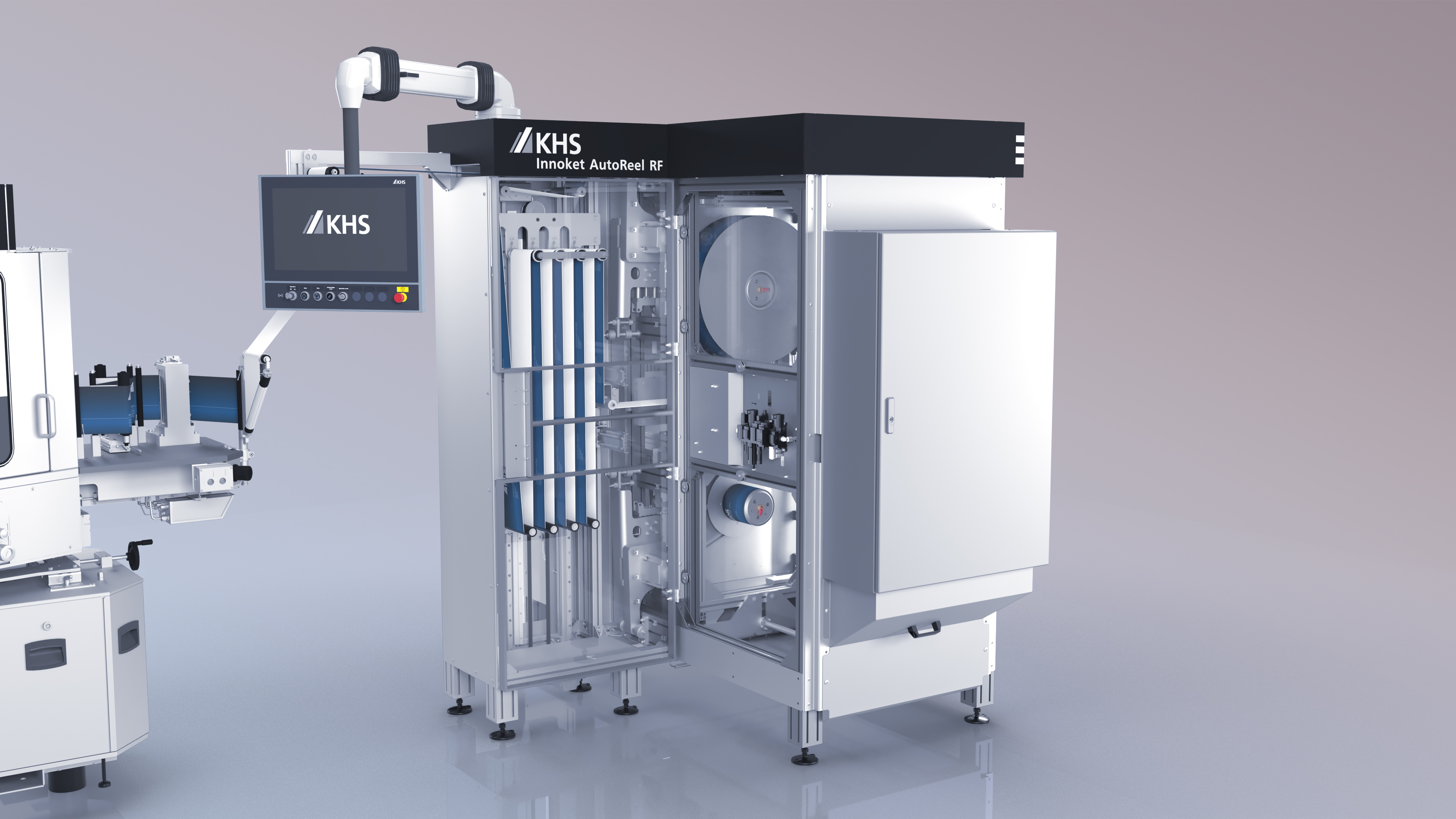 Das neue und kompakte Rollenspeichersystem KHS Innoket AutoReel der KHS Gruppe ermöglicht bis zu acht Stunden Rollfed-Etikettierung ohne Bedienereingriff.