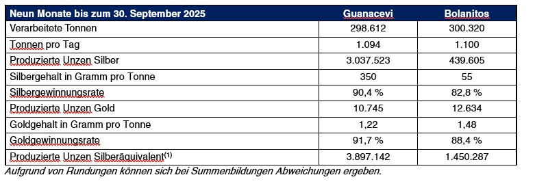 Tabellen mit den Produktionszahlen für die neun Monate zum 30. September 2025 für die in Mexiko betriebenen Minen