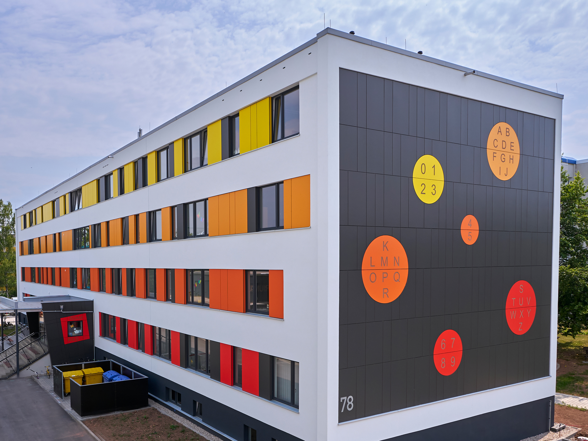 Die Adam-Ries-Grundschule im Zwickauer Stadtteil Neuplanitz wurde ursprünglich in den 1970er-Jahren errichtet und 2022 energetisch saniert. Als Grundfarbe auf den Giebeln wählte der Architekt einen dunklen Anthrazit-Ton (RAL 7016), der für die Fensterprofile als Standardfarbe zur Verfügung stand. Die verschiedenfarbigen runden und rechteckigen Akzent-Tafeln gewinnen zusätzlich an „Leuchtkraft“ auf den dunklen Giebeln. Wiederholt werden die Akzent-Farben jeweils zwischen den Fenstern.