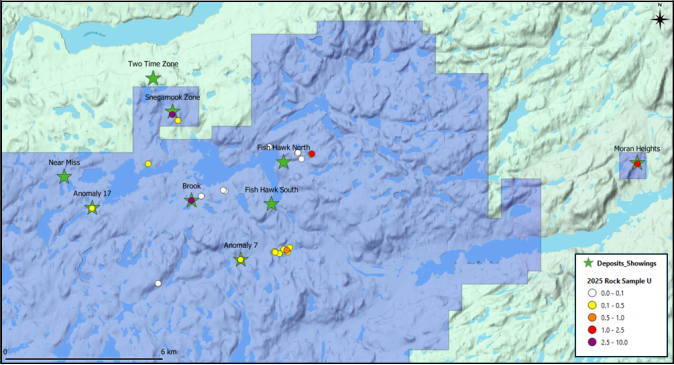 Abbildung 4: Westblock des Projekts Harrier mit der Lage der Uranvorkommen und den Uranproben aus dem Jahr 2025. Die Proben sind entsprechend ihrem U3O8-Gehalt farblich gekennzeichnet