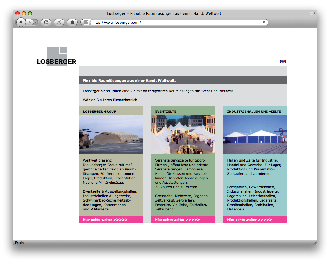 Auf der Landingpage werden die drei Unternehmensbereiche bzw. Produktgruppen kurz vorgestellt, um dem User die schnelle gezielte Suche zu erleichtern.
