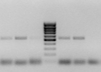 Nachweis der Herpes-Virus-DNA. Die spezifische Länge des über die PCR vermehrten DNA-Abschnittes (Banden) wird anhand eines Größenstandards (Bandenmuster, Mitte) bestimmt