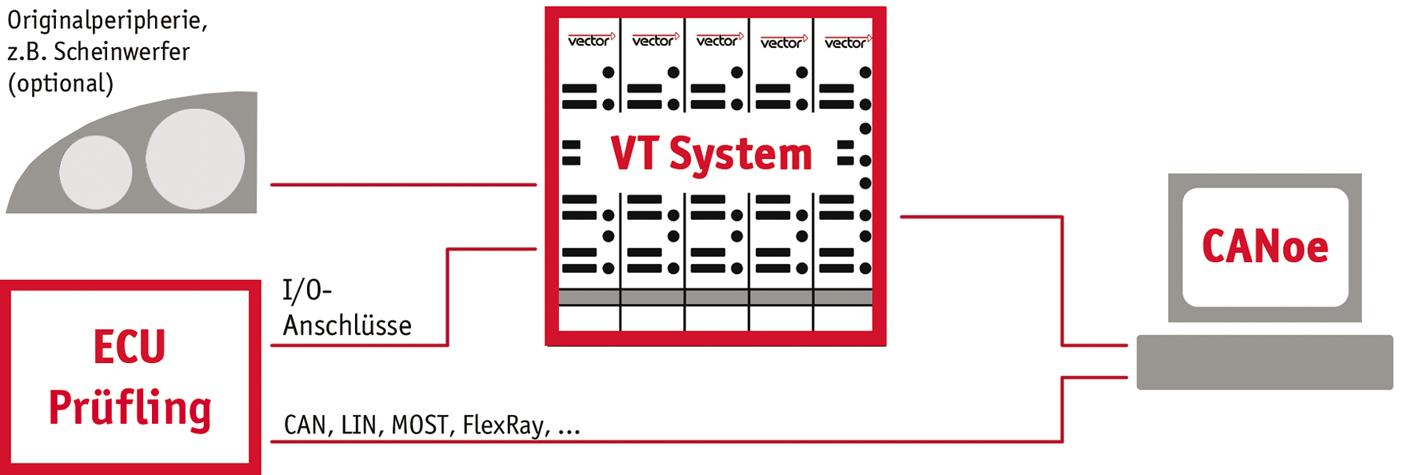 Mit dem VT System können reale und simulierte Ein- und Ausgänge von Steuergeräten in einen Tester auf CANoe Basis eingebunden werden