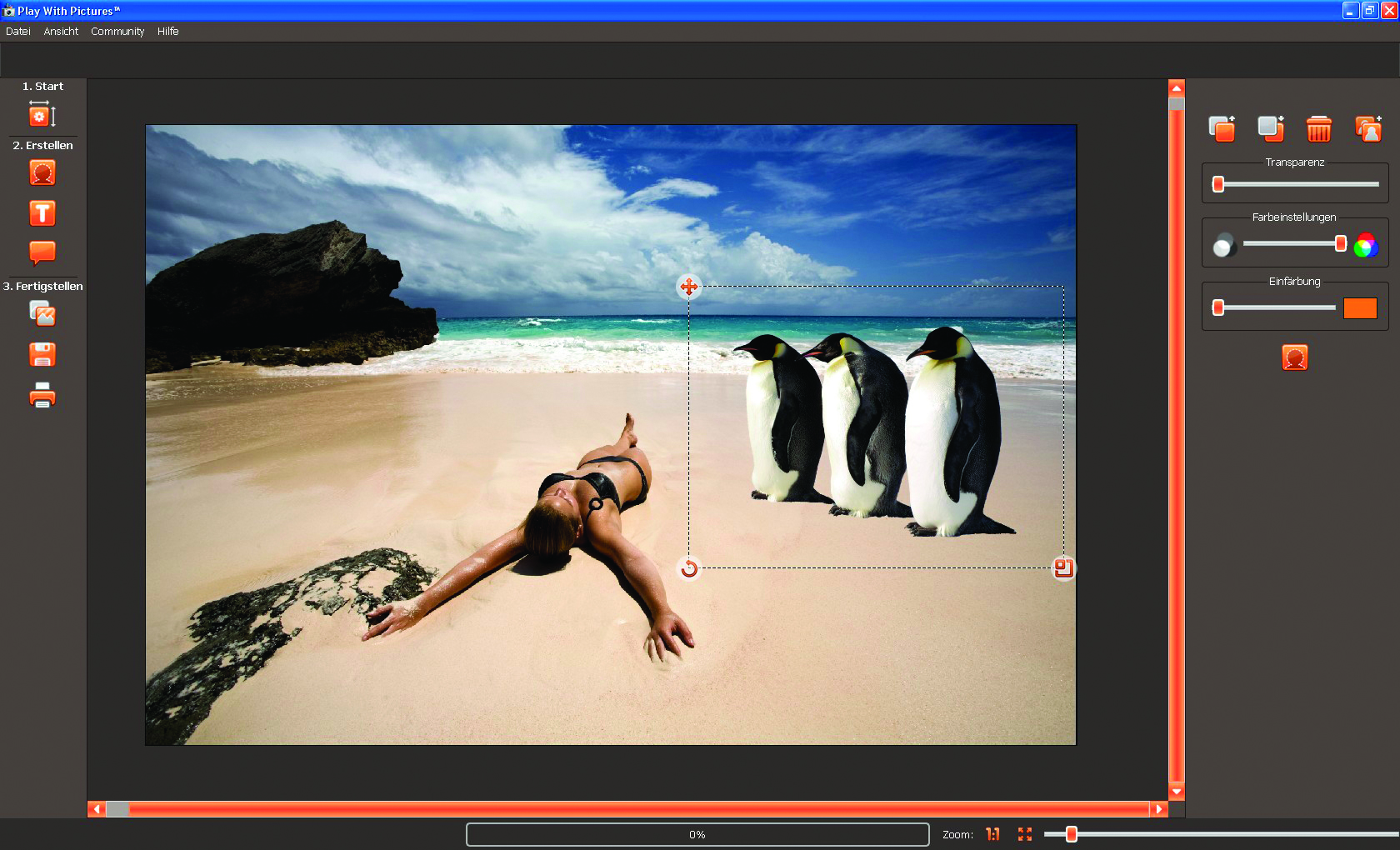 Mit Play with Pictures können kinderleicht Fotomontagen erstellt werden. Da können selbst Pinguine über einen tropischen Strand spazieren.
