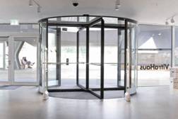 Ganzglas-Karusselltüranlage GEZE TSA 325 NT ohne Mittelsäule und barrierefreie Automatik-Drehtür mit der Antriebseinheit Slimdrive EMD-F