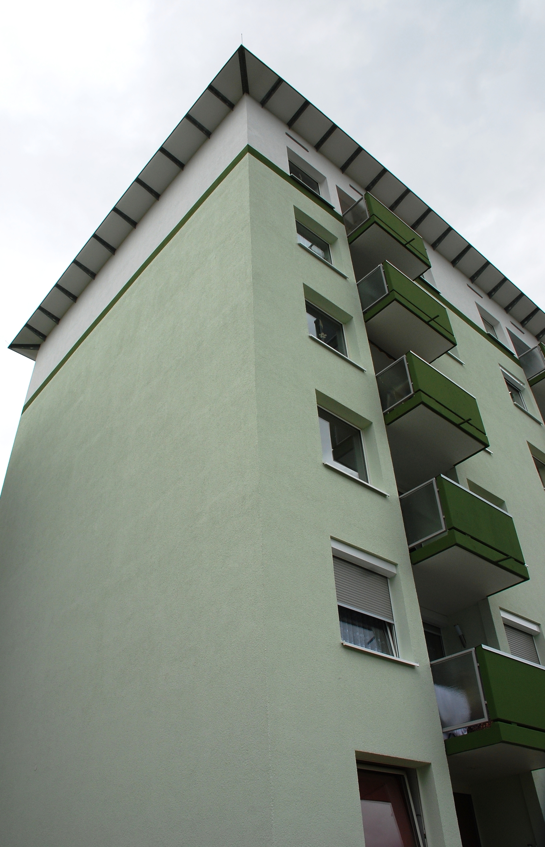 Je zwei Gebäude sind in harmonisch abgestuften Cognac-, Grün- und Blautönen gehalten