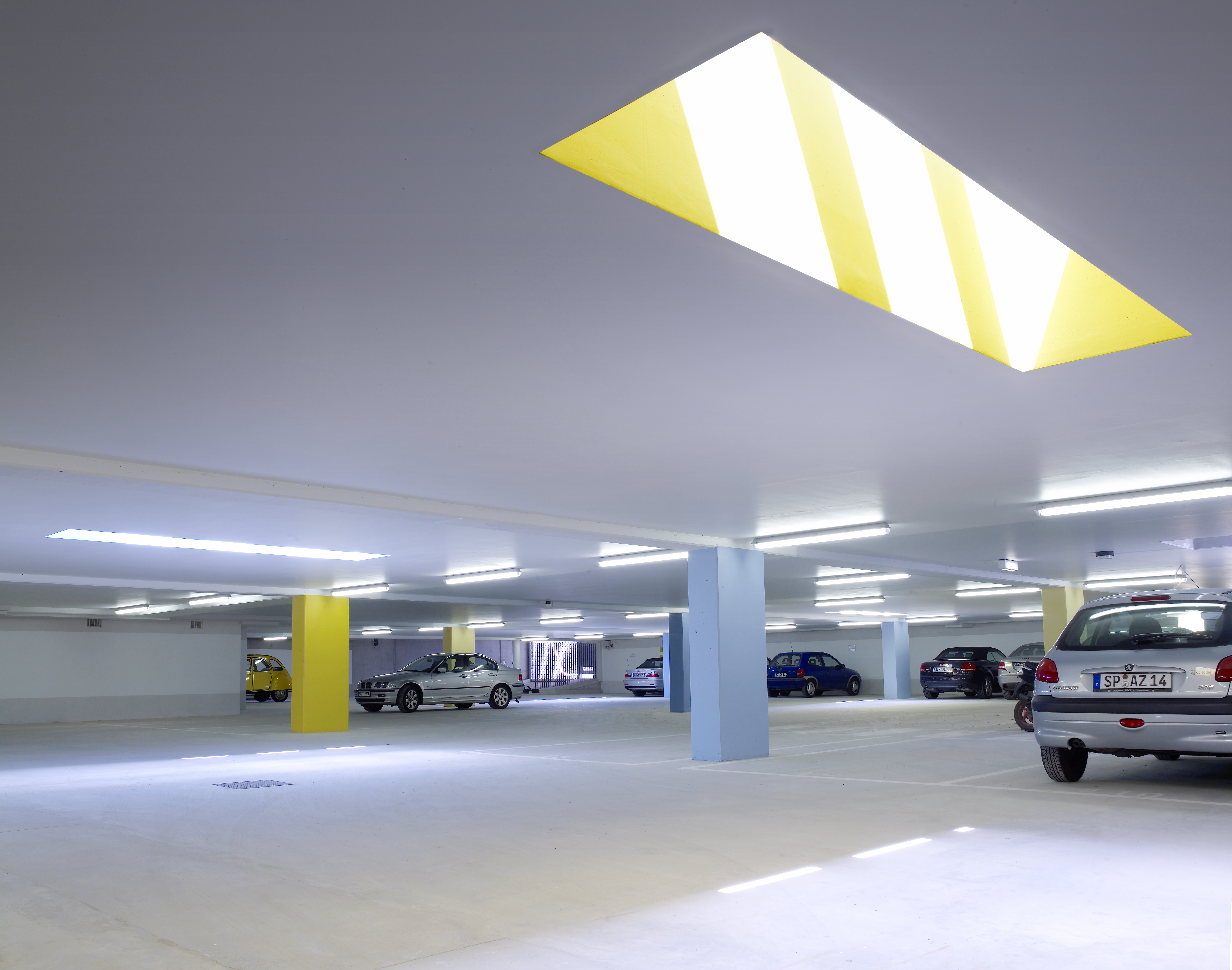 In der freundlich gestalteten Tiefgarage wissen die Bewohner ihre Kraftfahrzeuge gut und sicher aufgehoben. Apart gestaltete Lichtschächte sorgen hier für Tageslicht, (Foto: Caparol Farben Lacke Bautenschutz/Uwe Keller)