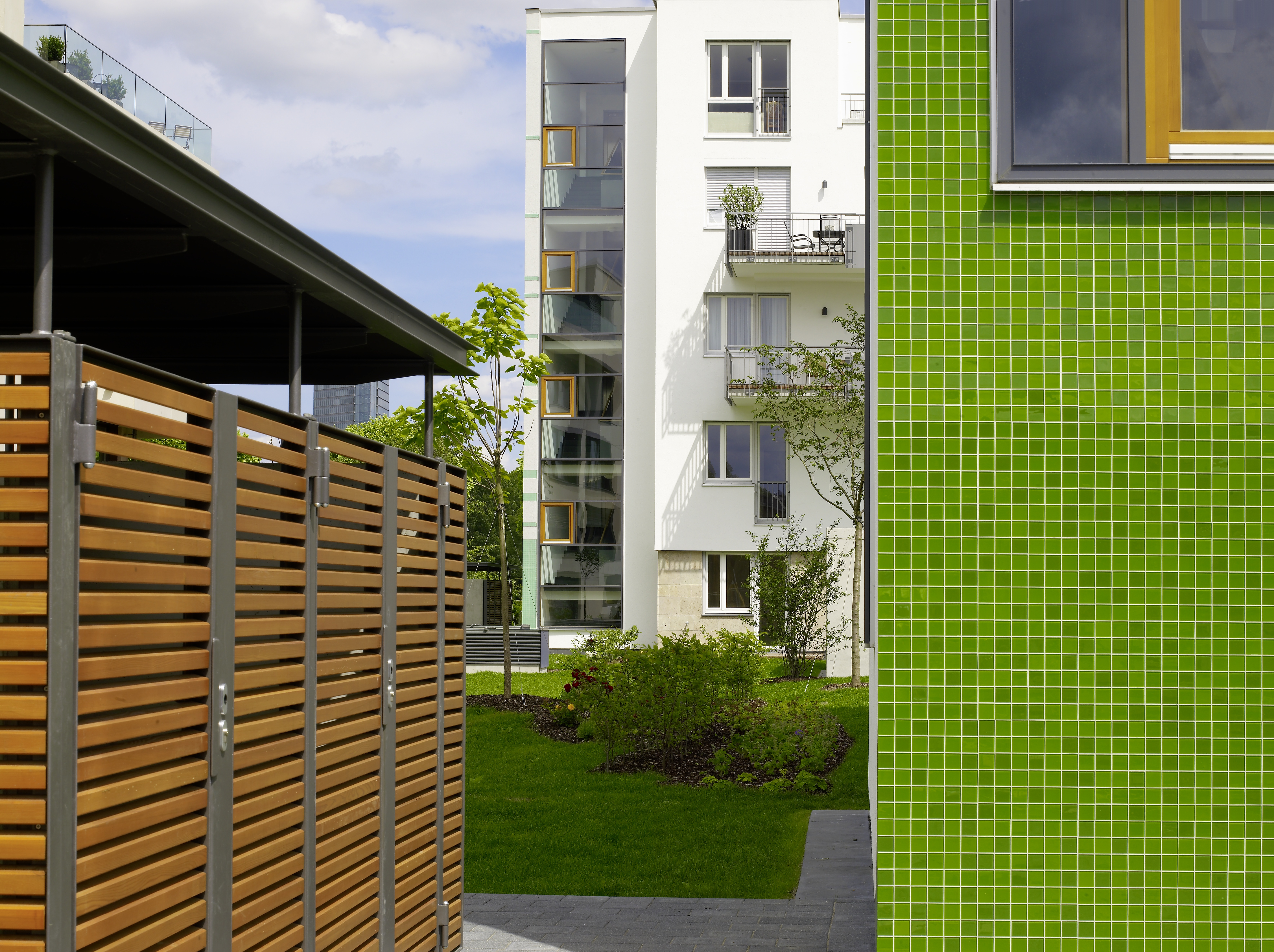 Holzverkleidete Nutzbereiche, Löffel-Naturholzfenster, großzügig verglaste Treppenaufgänge, schneeweißer Putz und vor allem die in verschiedenen Grüntönen changierenden Glasmosaik-Teilflächen der Außenwände sorgen für ein sehenswertes Erscheinungsbild des geschmackvoll arrangierten Gebäudeensembles, (Foto: Caparol Farben Lacke Bautenschutz/Uwe Keller)
