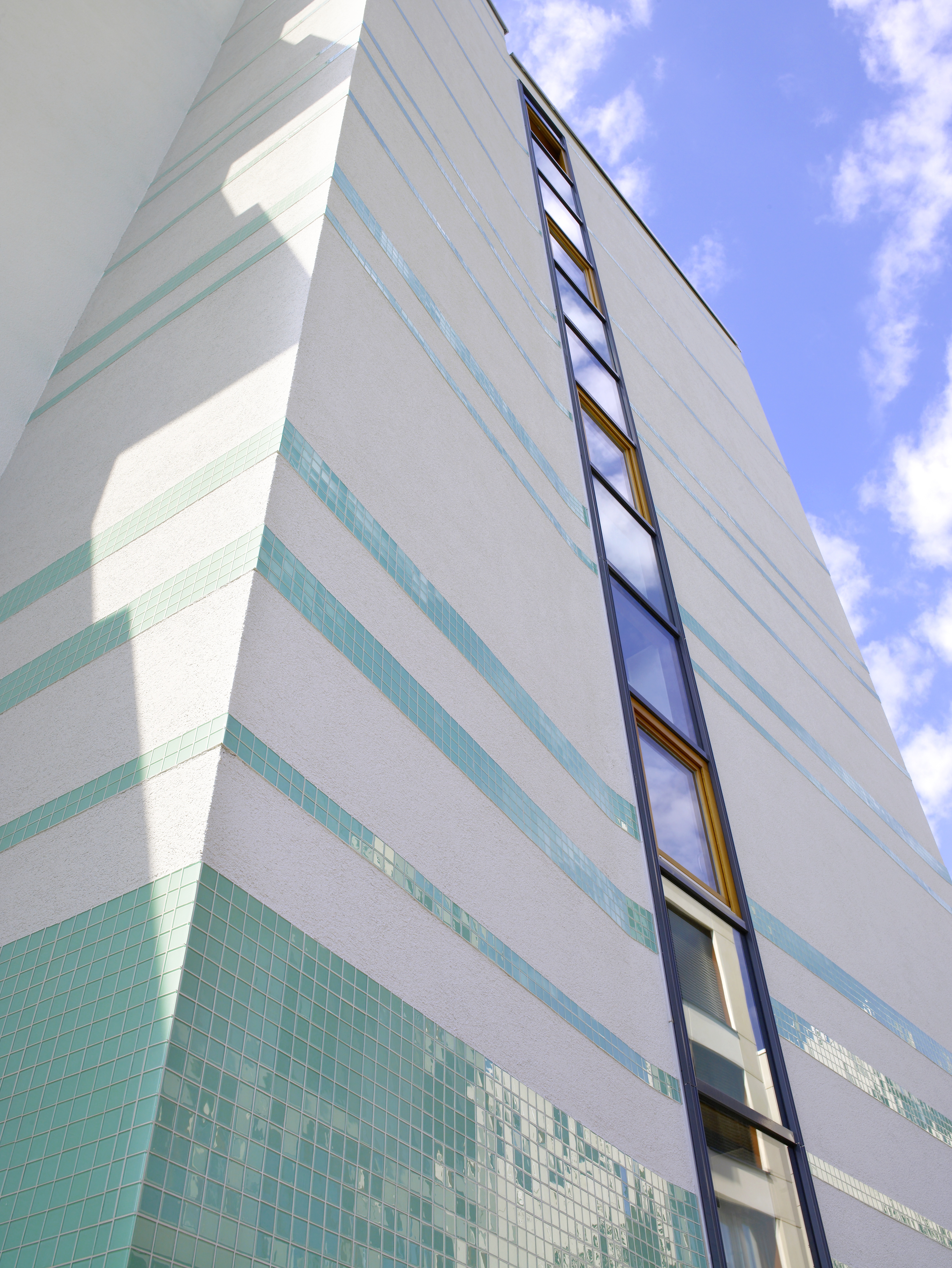Im Glasmosaik bricht sich das Sonnenlicht an der Fassade, so dass sich der Betrachter an das Wellenspiel des Rheins erinnert fühlt, (Foto: Caparol Farben Lacke Bautenschutz/Uwe Keller)