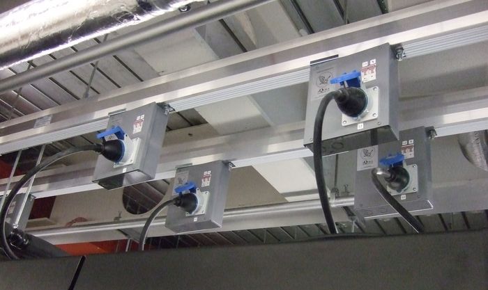 Hier ein Beispiel für die Stromversorgung per Schiene und Abgangskästen in einer Overhead-Infrastruktur.
