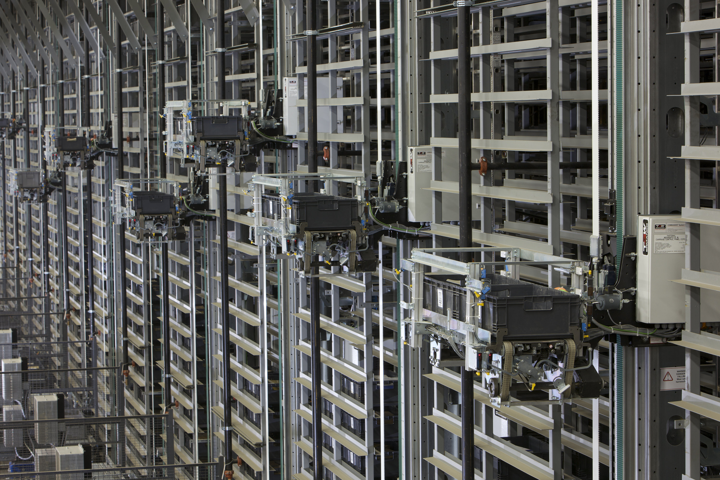 12 TGW Mustang Regalbediengeräte mit doppelttiefem Kombiteleskop bilden das Herzstück der Kommissionierversorgung