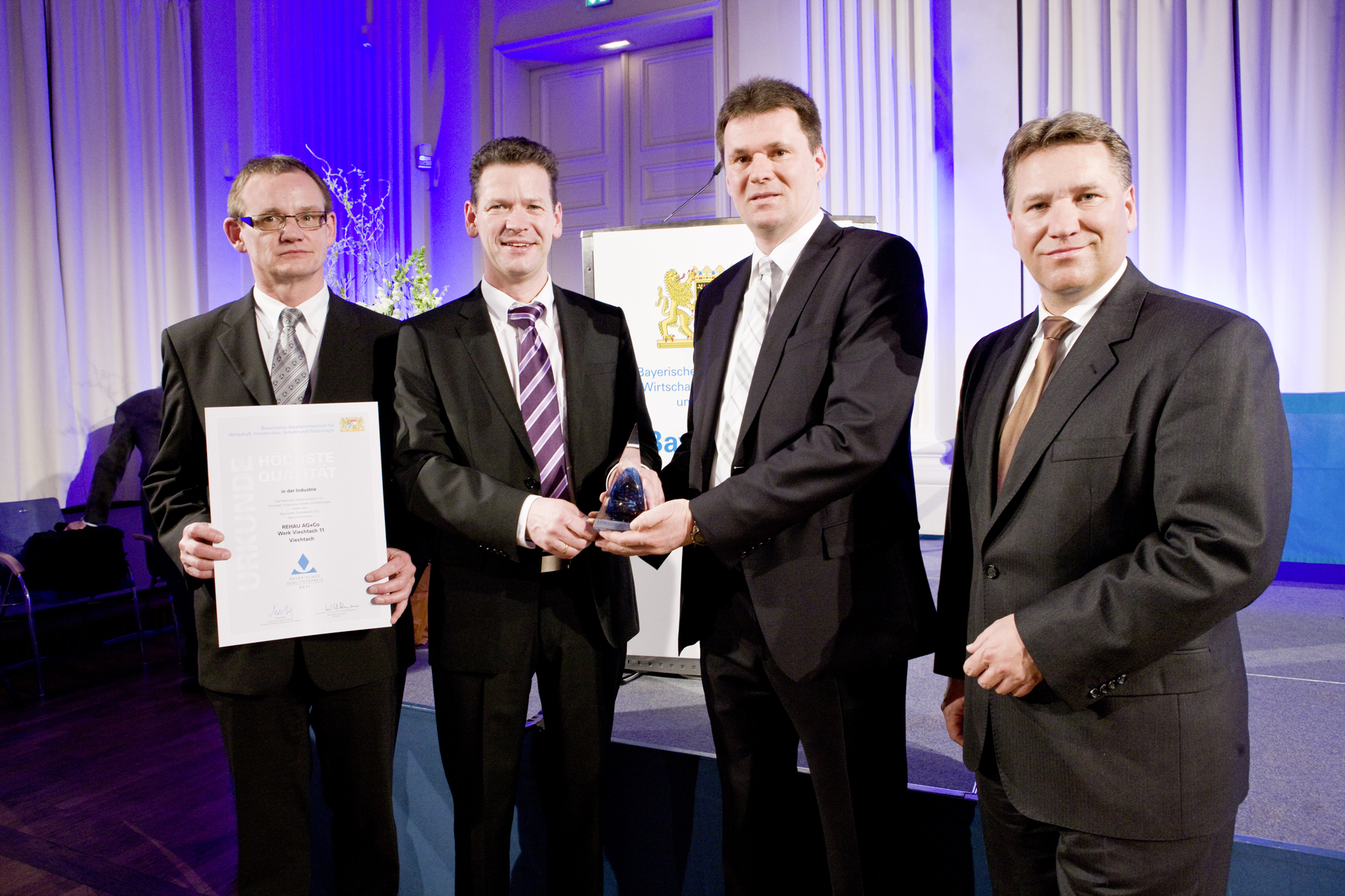 Der Vorsitzende der Geschäftsleitung der REHAU-Gruppe, Rainer Schulz, Dr. Frank Fleissner, Leiter Qualitätskoordination, Michael Friedrich, Leiter Qualitätsmanagement, und Werkleiter Stefan Tetek (von rechts) nahmen den Bayerischen Qualitätspreis in der Münchner Residenz entgegen.