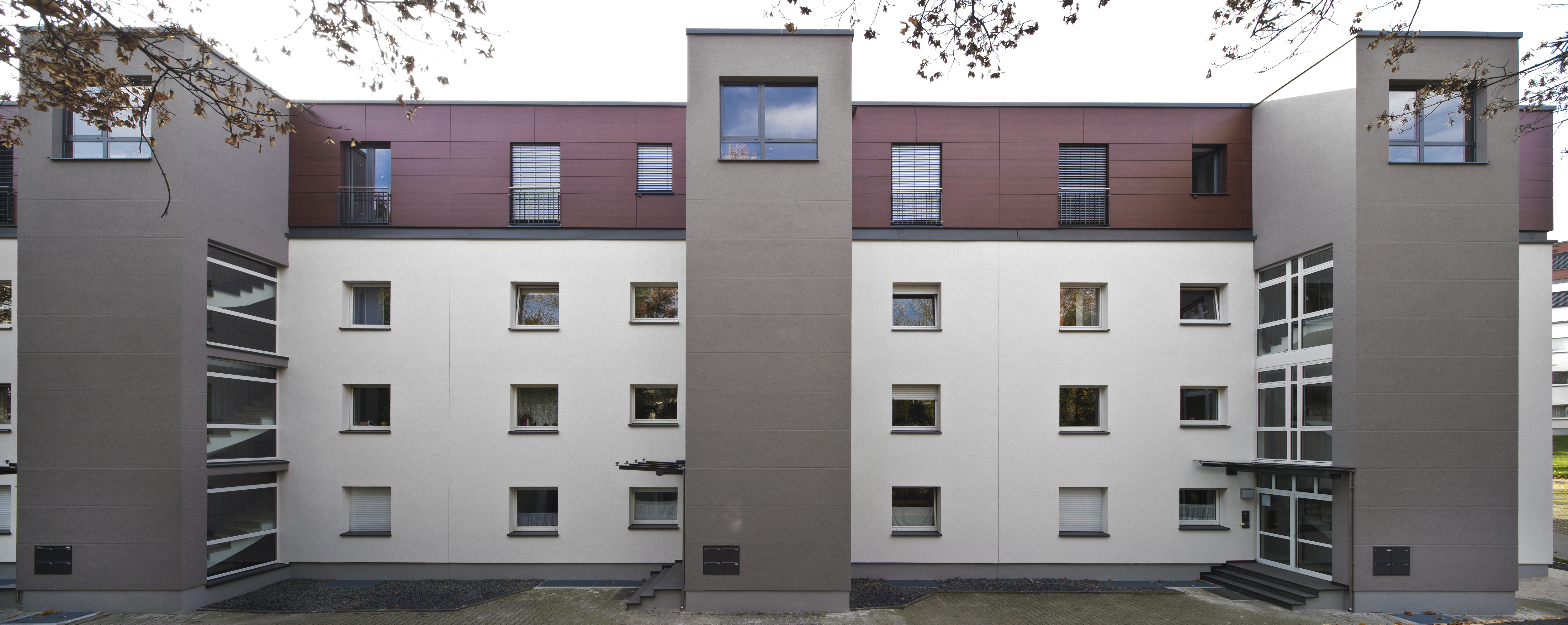 Die Neugestaltung der oberen Fassadenbereiche erfolgte teilweise mit Holztafeln und lässt Bestand und Erweiterung als architektonische Einheit mit attraktiven Akzenten erscheinen, Foto: Caparol Farben Lacke Bautenschutz/Martin Duckek
