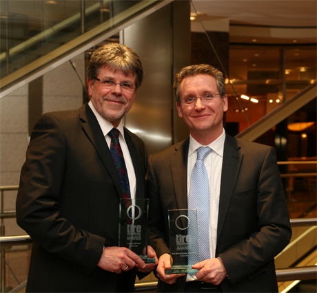 Jörg Nohl, Vice President Engineering Tires, und Christian Sass, Leiter des Geschäftsfelds Runderneuerung Lkw- und Busreifen, nahmen die Awards für Continental in Köln entgegen